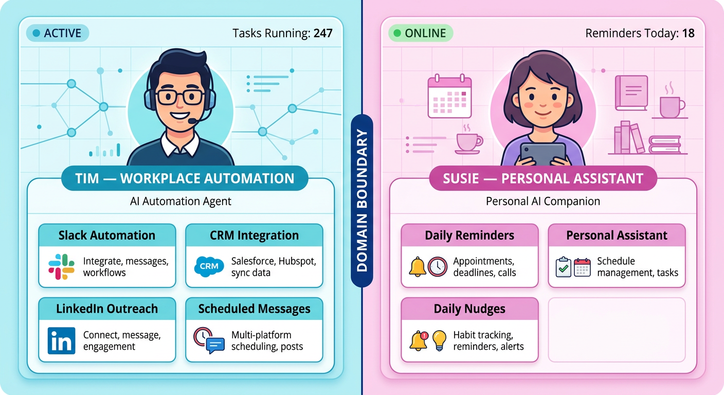 Each agent gets its own domain -- Tim handles outbound, Suzi handles personal rhythm.
