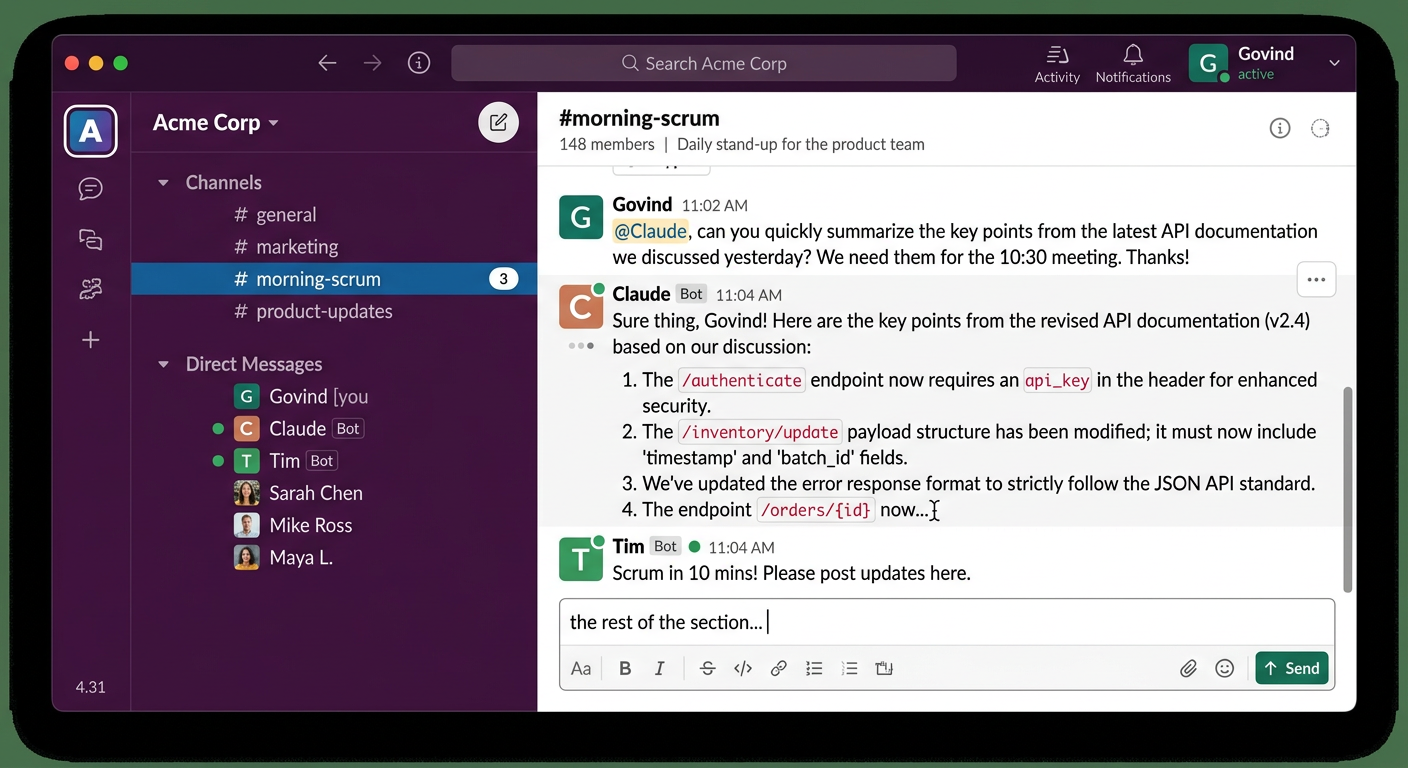 Once Claude was in Slack, the whole dynamic shifted. Now I can talk to Claude right where I am already working. I can ask it to draft content, analyze a thread, or help me think through a problem -- all without leaving the conversation.