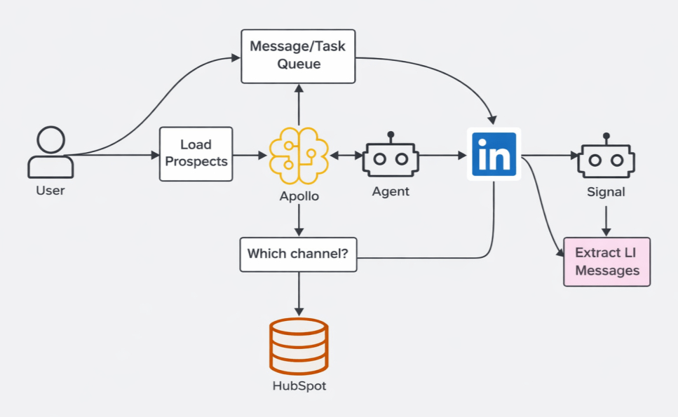 The Revised Flow: User loads prospects -> Works on the message task in Apollo -> Sends via Signal/LinkedIn -> Syncs to HubSpot.