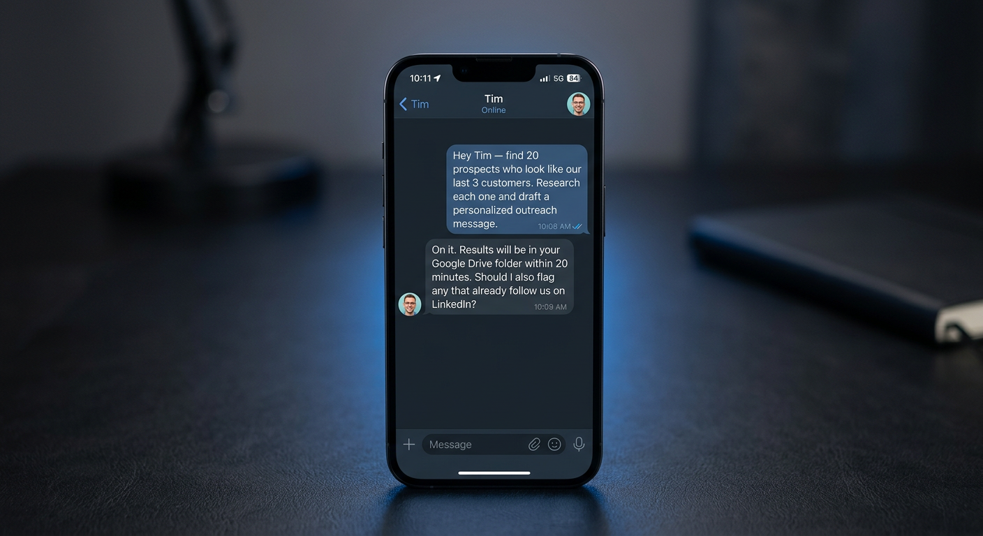 Tim changes that equation entirely. I can tell Tim: find me 20 people who look like our last three best customers, do the research on each of them, and draft a personalized LinkedIn message for each one. Tim goes and does it. What lands in my Drive folder is a first draft I can review in thirty minutes and send with thirty seconds of editing. My brain stays on the decision-making. Tim handles the legwork.