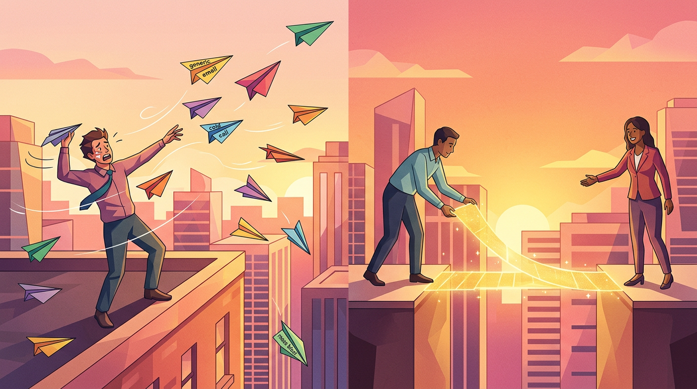 He used a killer analogy: imagine walking into a physical sales meeting and immediately pulling out your product catalog. You'd lose the room. The same principle applies digitally, but it's even more critical because trust is harder to build through a screen.