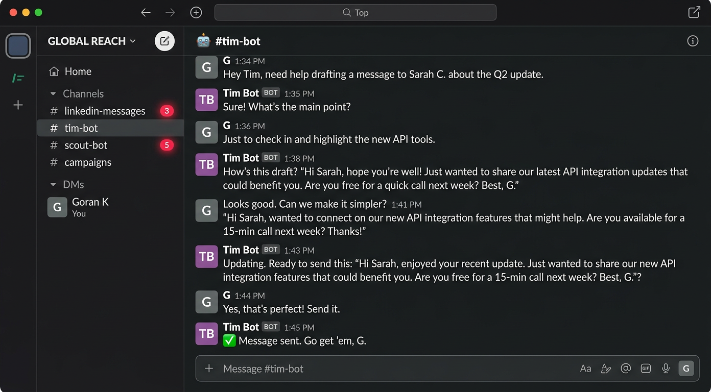And I'm not talking about some canned template that got blasted to a list. This is me working with an AI bot inside my Slack workspace. The bot had knowledge about the person. It understood the campaign. It constructed the message. We worked on it together — back and forth in a Slack thread — and then Tim sent it through LinkedIn. If you think that's easy, you are crazy.