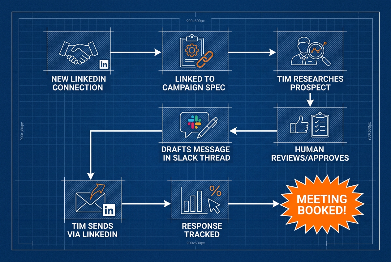 So now when a new connection comes in on LinkedIn, the person gets linked to a campaign, and Tim has the full context of what we're offering and why it matters to them. He pulls up the prospect's information, cross-references the campaign spec, drafts a personalized message, and brings it to me in a Slack thread for approval. We iterate if needed — "Nah, Tim, adjust the tone here" — and then he sends it. The message that booked this meeting wasn't generic. It clicked because the whole system — AI research, campaign context, personalized drafting, human approval — worked together.