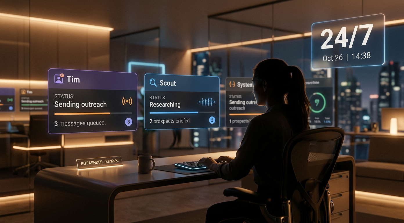 Something clicked for me this week that goes beyond the tech. We're not becoming AI-enabled people in the way everyone talks about it. We're becoming bot-enabled people. The difference is that it's not just "oh, I use an LLM to write better emails." It's: I have a little team of robotic agents, and I'm checking on them. I'm seeing how they're doing. They're talking to each other. They're handing off work. And it works.